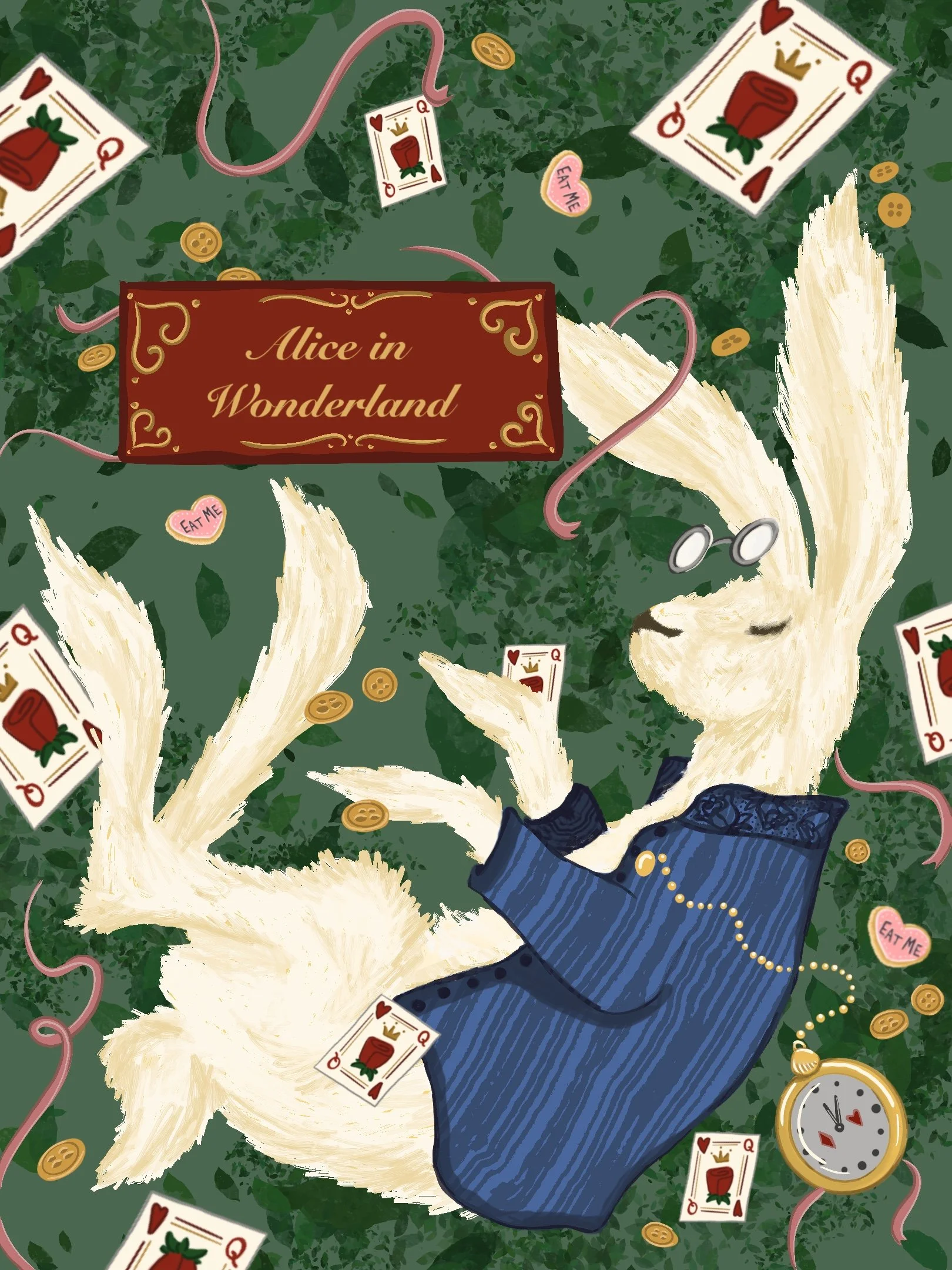 Alice in Wonderland digital graphic cover created in Procreate. This is a second draft that added more refined details and updated it too look like a finished final draft.